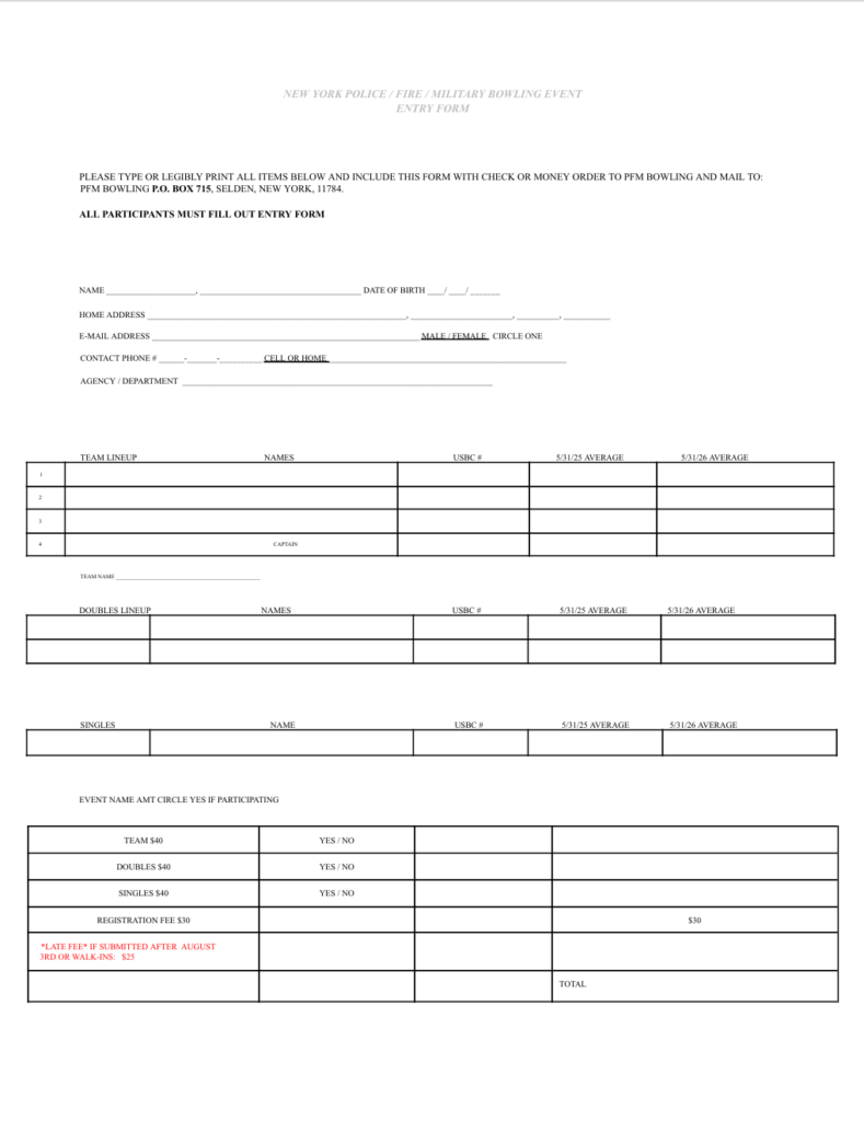 PLEASE PRINT OUT THE ENTRY FORM THEN LEGIBLY PRINT ALL ITEMS BELOW AND INCLUDE THE FORM WITH CHECK OR MONEY ORDER TO PFM BOWLING AND MAIL TO: